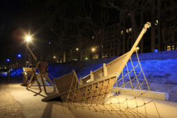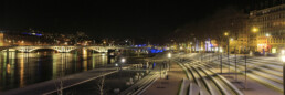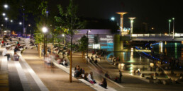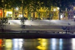 Les trois principes constitutifs de l’aménagement lumière s’enracinent dans l’identité du lit majeur du fleuve. Le mur perré, sinusoïde à la fois rudimentaire et monumentale, protège la ville de l’impétuosité du fleuve et endosse la fonction symbolique de témoin de la sédimentation historique de Lyon. La nuit métamorphose ce rempart de l’insouciance riveraine en une cimaise enrubannée de clair de lune. Les ducs d’Albe, réinventés en sentinelles lumineuses, scandent la promenade de jalons robustes, capables de résister aux caprices du Rhône. Ponctuation régulière et stable, leur ligne offre l’assurance d’une main