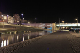 L’aménagement lumière des Bas ports du Rhône est véritablement à Lyon le premier projet lumière dit d’intégration, par opposition à la surenchère. Le site constitue une forme singulière d’aparté urbain.